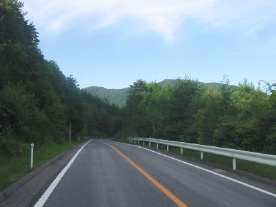この最初の区間では、沿道には何もなかったと思う。黄色いセンターラインの2車線道で、ずっと森の中。(右上写真)