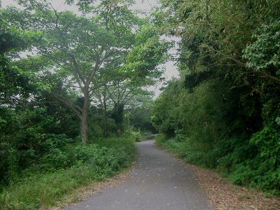 近くにある愛宕山は千葉県最高峰で、山頂部は航空自衛隊のレーダー基地になっている。T字路(↑)に出て、左へ。逆方向から来ると、自衛隊基地へが道なりで、林道が右折になるが、案内表示はあった。