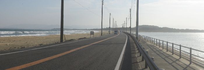 金印公園の先は狭い1.5車線道へ。まさにシーサイドという道で、釣り人のらしき車がところどころに止めてあった。