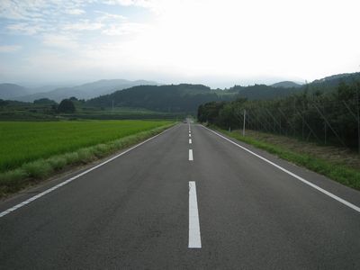 森の中へ登った後、けっこう下っていくと、農村へ出る。最後の方は、山に挟まれたローカルな田園地帯を走っていく。(右写真)