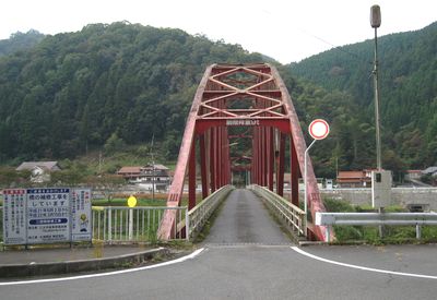 赤い吊り橋で、欄干も赤。両サイドに、赤いポニートラスがついていて、補強しているようだ。