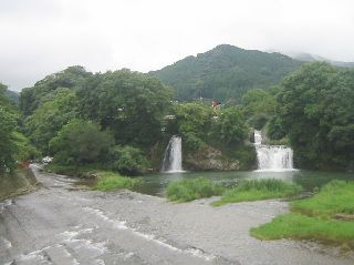 北側の駐車場から歩いて行くと、すぐに川を横切る橋があり、その橋の上から滝を眺めることができる。左右に2本滝があり、その中央に、赤い不動明王が立っているのが特徴だ。落差11メートルとのこと。