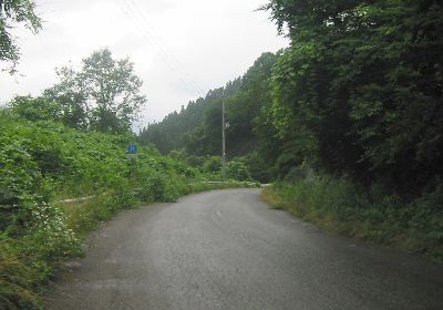 峠へ登っていくあたりは、地図に千本桜とあるので、その季節はきれいなのだろう。沿道に建物はない。上の方ではセンターラインがないが、1.5車線道としては広め。(下写真)