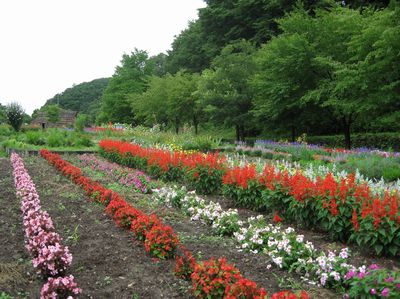 万葉の花園には、色とりどりの花が並んでいたほか、左奥の斜面は、ハスの花畑になっていた。
